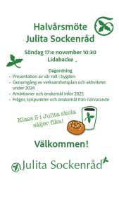 Styrelsen i Julita Sockenråd bjuder in allmänheten till Lidabackegården på söndag 17/11 kl 10:30 för halvårsmöte med gofika!
