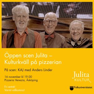 Kvällens livemusik står KAJ för, trion med mångsysslaren Anders Linder i spetsen, ackompanjerad av Kjell Berggren och Jan Bergnér. Vi får jazz och blues i 50-talsstil och kanske några gamla svenska låtar.